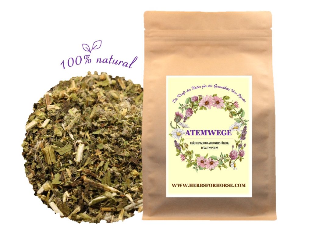 Kräutermischung für alle Arten von Pferden. Eine Mischung aus wirksamen Kräutern zur Verbesserung der Atmung von Pferden bei erhöhter Anstrengung, für Pferde mit Erkältungen, Kurzatmigkeit, zur Beruhigung und Entspannung der Atmungsorgane.